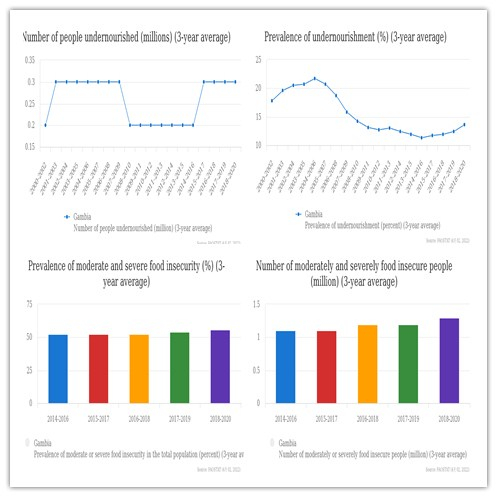 As shown in Figure 6, prevalence of undernourishment (3-year average) in The Gambia during 2000-2002 was 17.8% (0.2 million) and prevalence of moderate and severe food insecurity (three-year average) during 2014-2016 was 52.7% (1.1 million); By 2018-2020, Number of people undernourished in The Gambia was still 0.3million, and Number of moderately and severely food insecure people was 13.6% (1.3 million). Overall national food security and malnutrition crisis remains acute.
