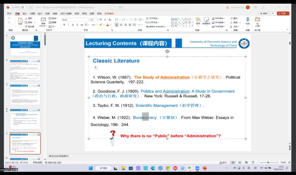 On December 15, 2022, SPAA holds a session on the review of PA study and workshop on how to define a good thesis topic for first-year international students. This all-important session was held via Tencent meeting. Prof Zhao Shurong, Prof Liu Xuan, Associate Prof Ren Yang, Associate Prof Fan Xin and Dr Dumor Koffi were invited to join this event. The event aims to review the course work of this semester and to prepare the thesis proposal in the next semester.